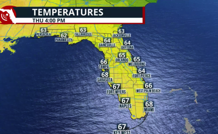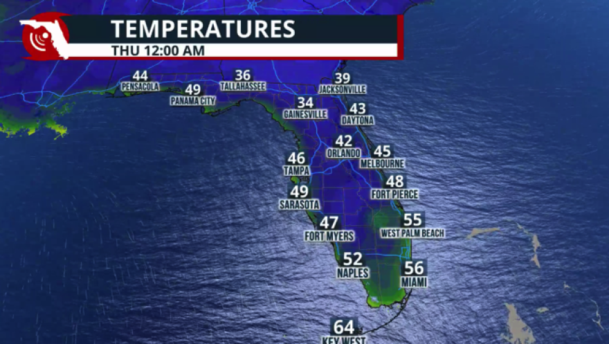 Temperatures around midnight will be in the low 50s across South Florida, while Southwest Florida will be in the upper 40s. Central Florida, including the Space Coast, will have temperatures around the low 40s, while North Florida will likely be in the upper 30s by midnight. The Panhandle is starting to warm up a little bit, especially across the western portion of the Panhandle. Cities like Pensacola could experience temperatures tonight warmer than those on Wednesday morning.