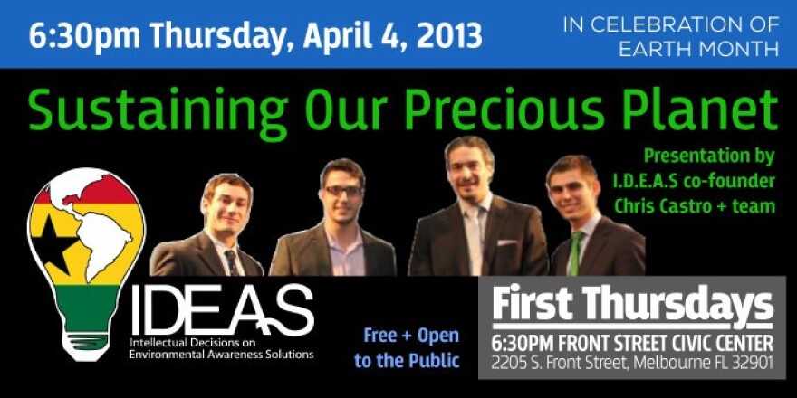 You can get an early start on your Earth Day agenda by attending the Space Coast Progressive Alliance's First Thursday Program on April 4th at 6:30 p.m. Titled "I.D.E.A.S. for our Environmental Future - Sustaining Our Precious Planet", the event takes place at Front Street Civic Center, 2205 S. Front Street, Melbourne. Special guest speaker is Chris Castro, Co-founder and Executive Director of I.D.E.A.S. (Intellectual Decisions on Environmental Awareness Solutions.) Castro and his team will share information about climate change and clean energy solutions. The event is free and open to the public.