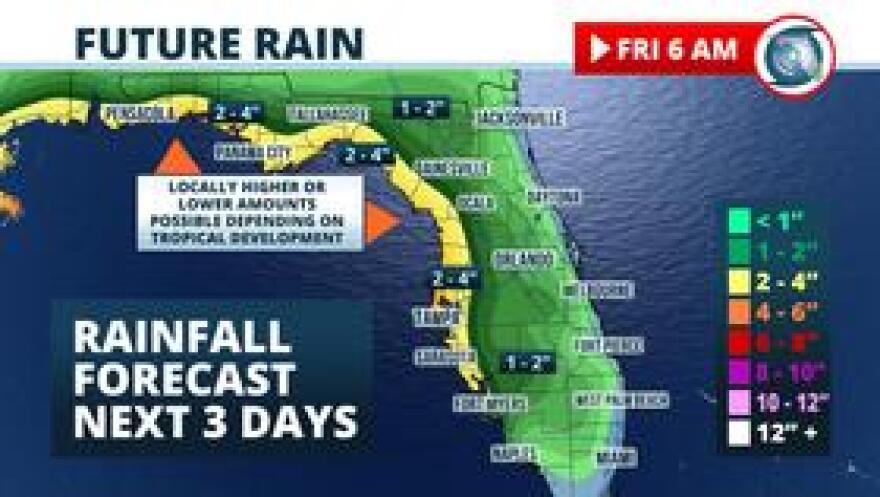 The eventual track and strength of the disturbance will be a significant factor in how much rain falls over the next five days. Forecasters at the Weather Prediction Center are outlining areas along the immediate Gulf coast from near Fort Myers to Pensacola to receive 1 to 3 inches of rain through Saturday night. Areas farther inland may not receive much more than what typical afternoon thunderstorms produce in July.