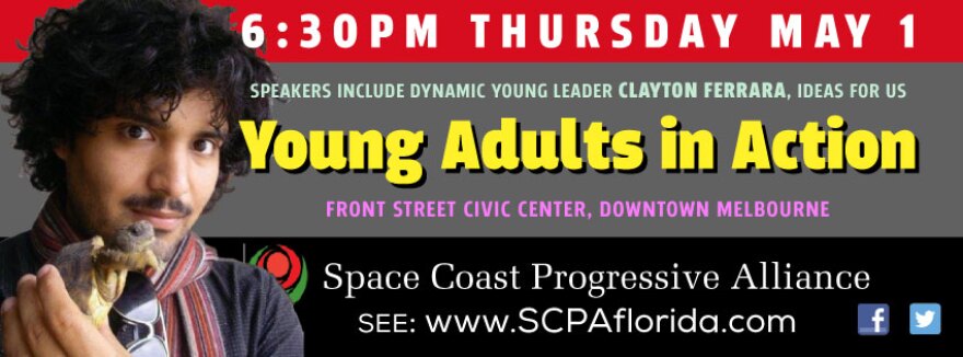 The Space Coast Progressive Alliance presents "Young Adults in Action" this Thursday, May 1, 6:30pm at the Front Street Civic Center in Downtown Melbourne. The event focuses on ways to reach out to and encourage young adults to become active participants in our community. The event features three special guests: